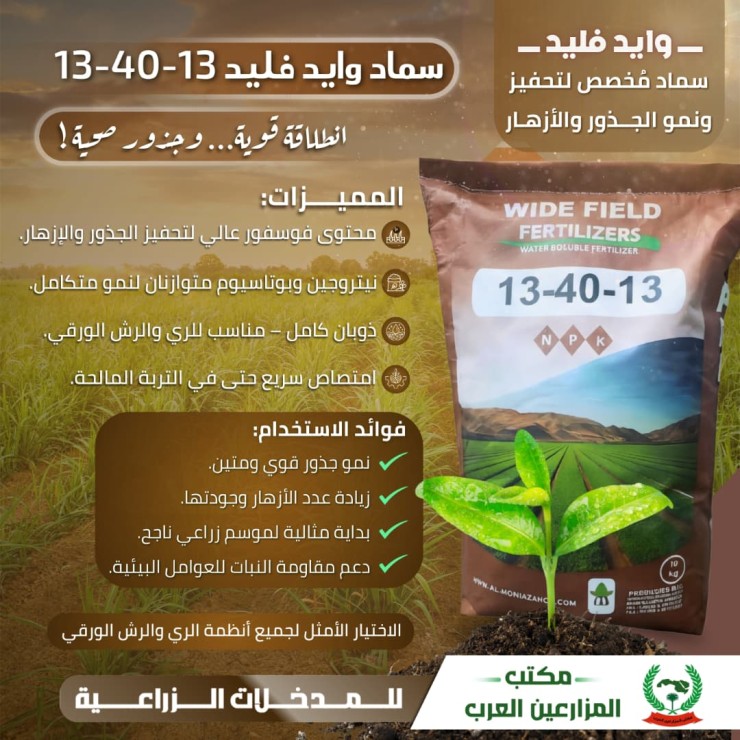 باستخدام سماد وايد فيلد NPK 13-40-13، يمكن للمزارعين تعزيز جودة محاصيلهم وتحسين إنتاجيتها بشكل ملحوظ.